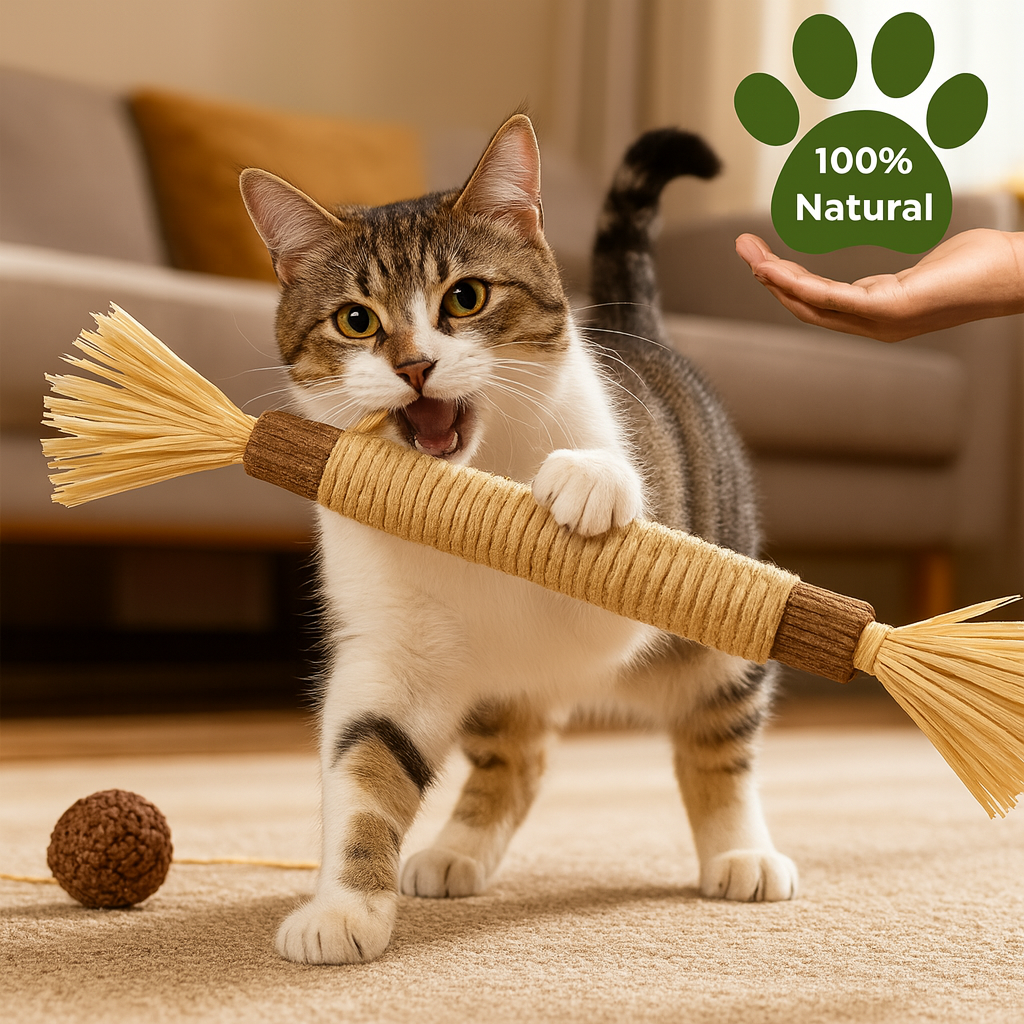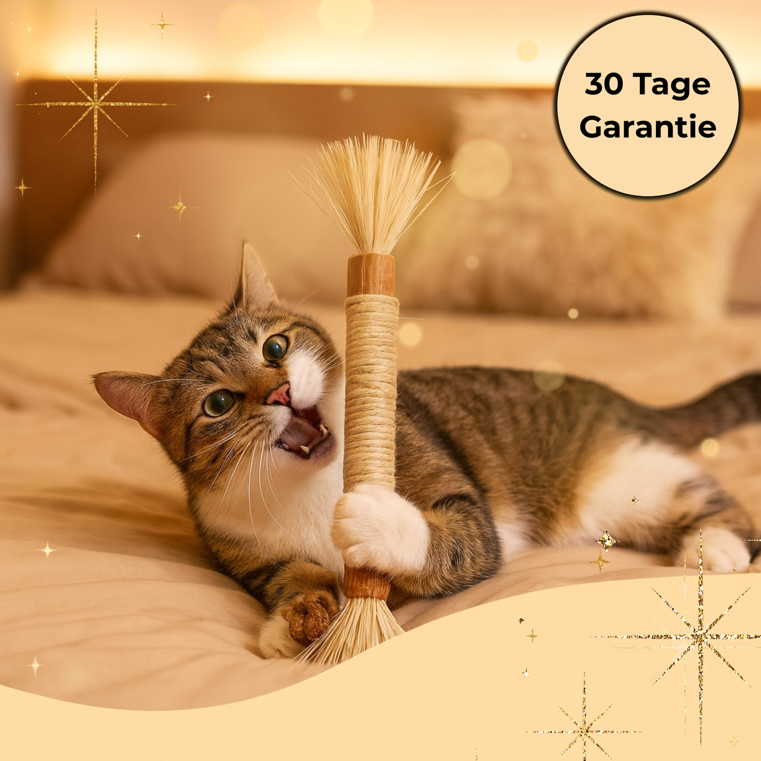 Ja. Der Stick besteht zu 100 % aus natürlichen Materialien wie Silvervine, Gallfrucht, Sisal und Raffia. Er ist unbedenklich, selbst wenn deine Katze kleine Fasern verschluckt.